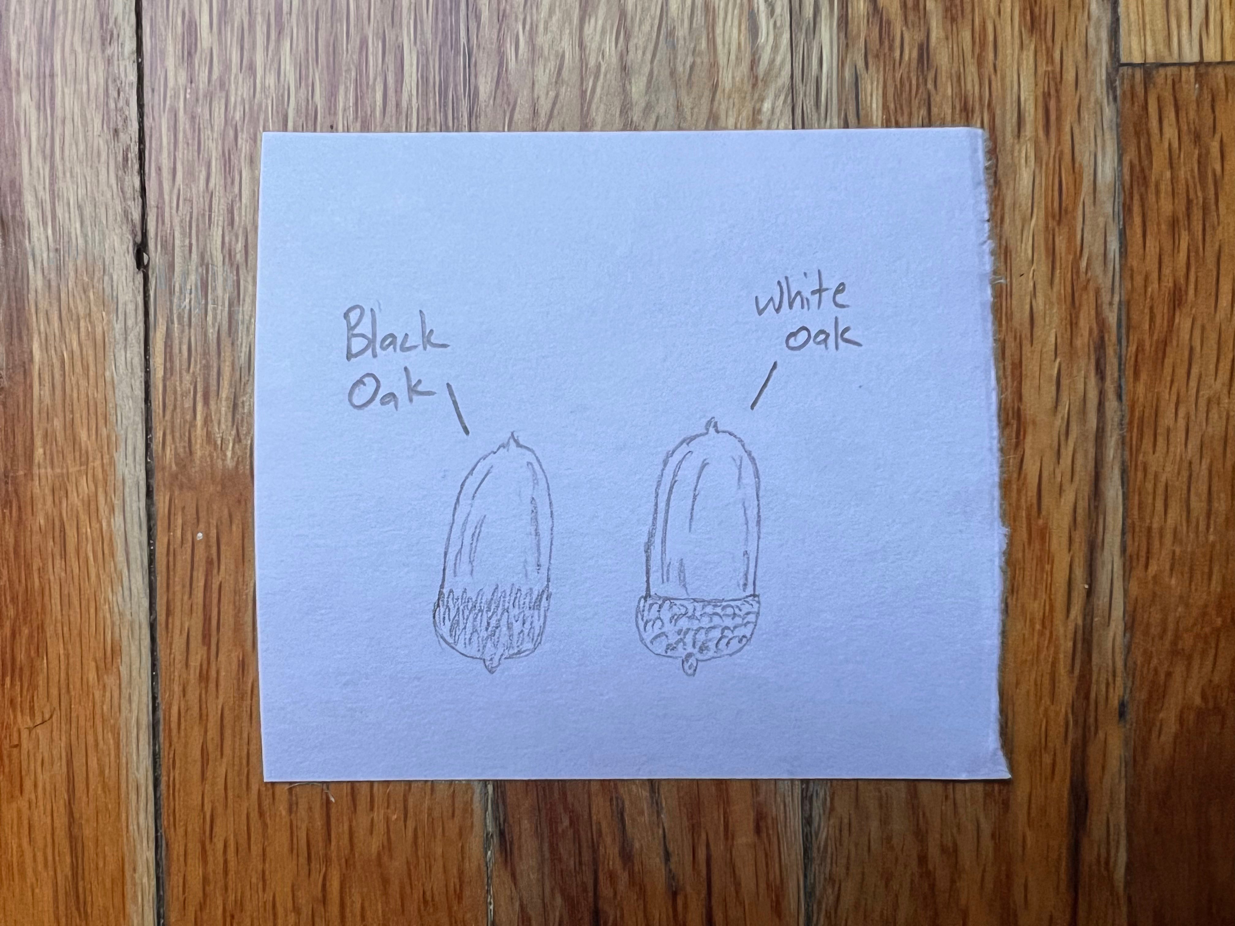 There’s one slightly more apparent way of distinguishing between White Oaks and Black Oaks: acorn caps. The scales of Black Oak acorn caps form a fringed edge where they hug the acorn body, while White Oak acorn caps end in a straight line around the acorn.