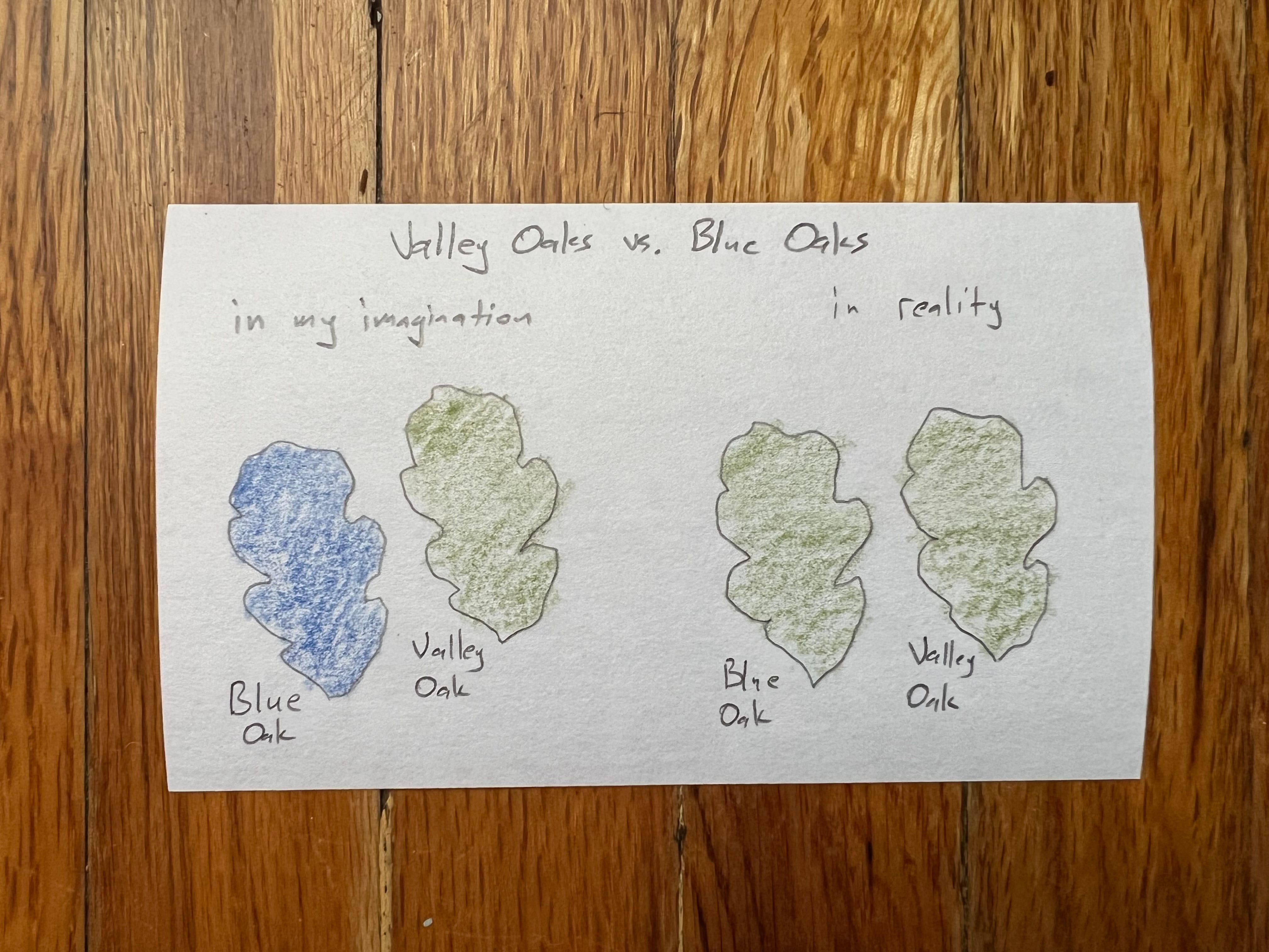 Science says you can tell it’s a Blue Oak because the leaves are blue-gray rather than a dark waxy green. Unless of course they are covered in dust, which tends to happen a lot outside, at which point it becomes difficult to tell what color the leaves are. When you’re not sure, just go with Valley Oak and hope nobody starts wiping dust off the leaves to prove you wrong.